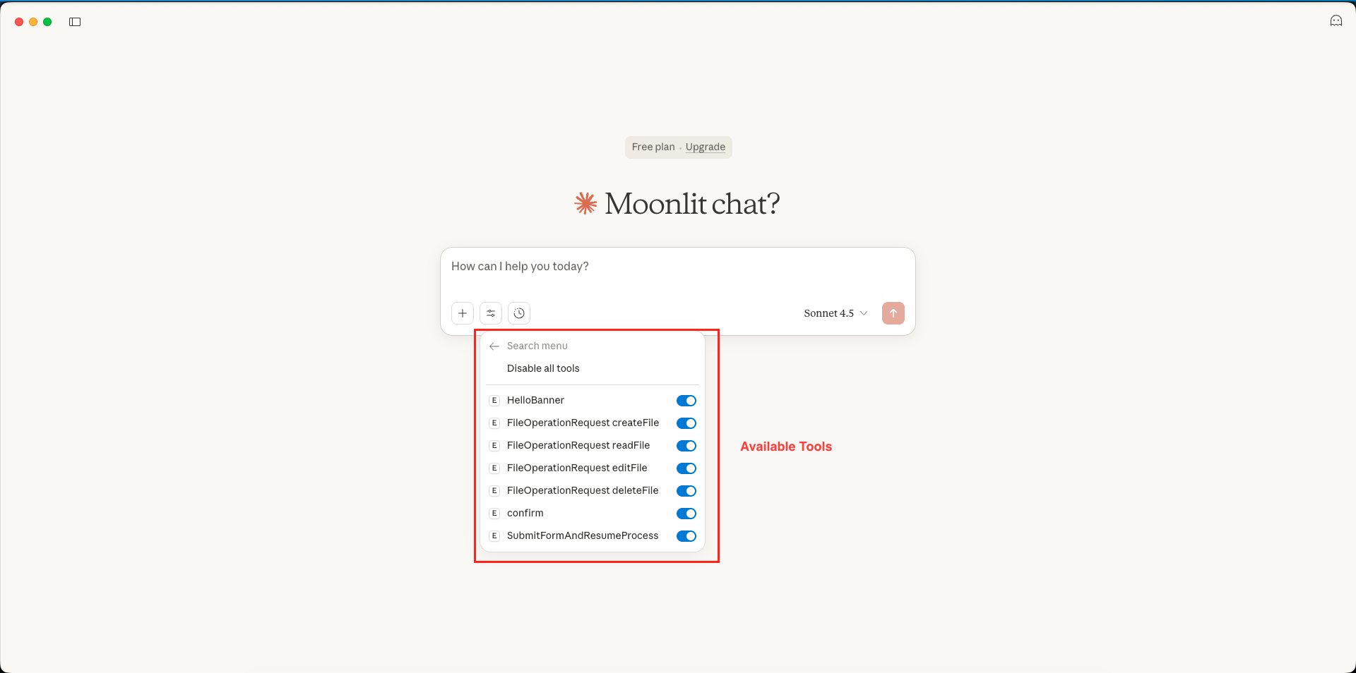 Look for “Search and tools” option in Claude Desktop’s interface. Click it to see available tools. You should see: – createFile – readFile – editFile – deleteFile