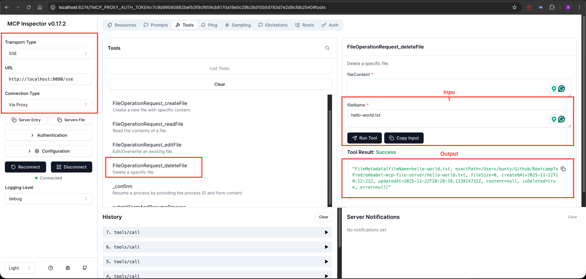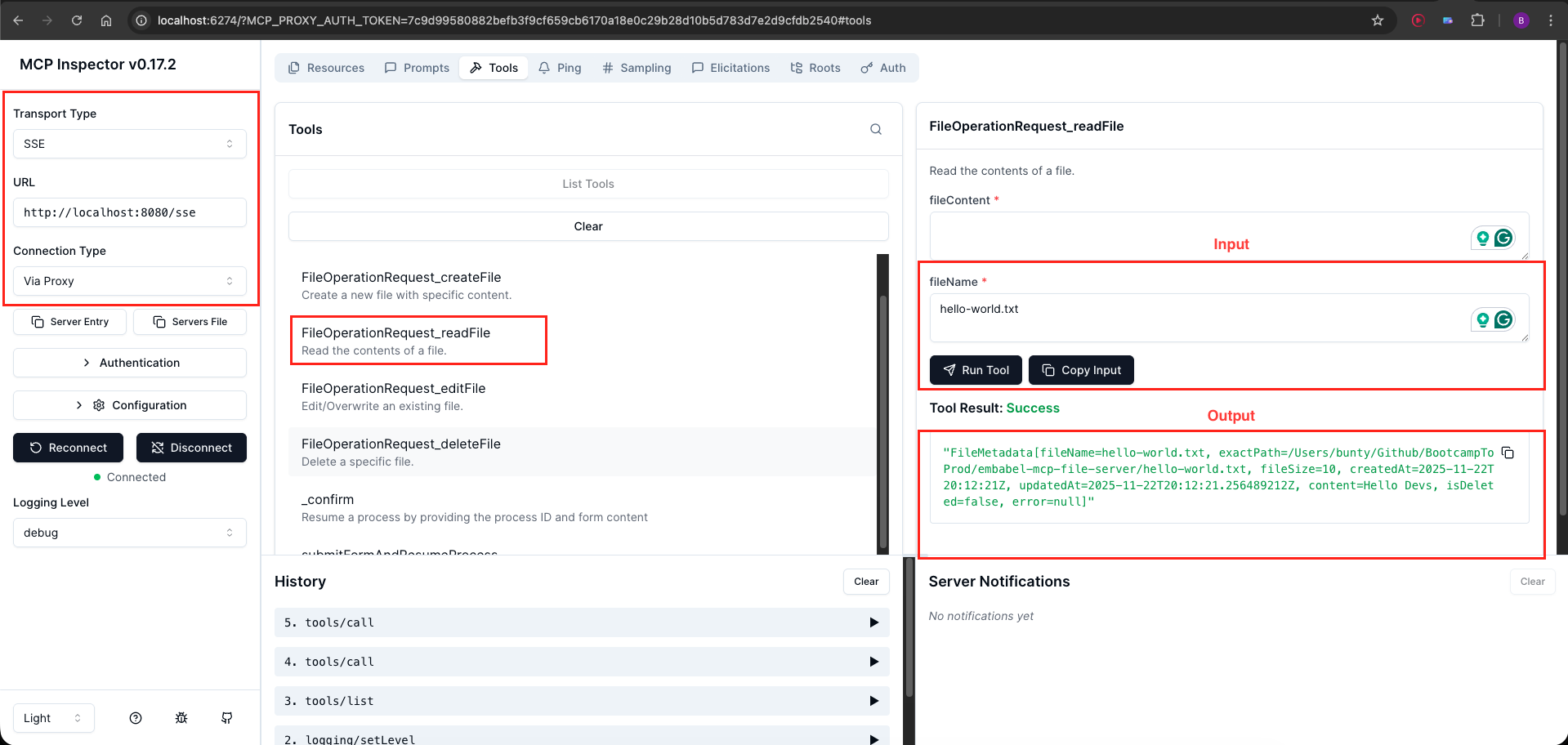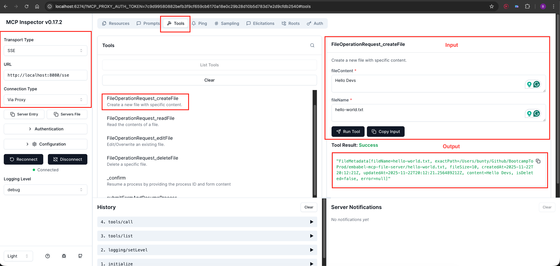 Notice the BASE_DIR variable in the code. We are using System.getProperty(“user.dir”). This means the MCP server is currently configured to operate strictly within your project’s root folder (where your pom.xml resides). If you create a file named hello.txt, it will appear there.