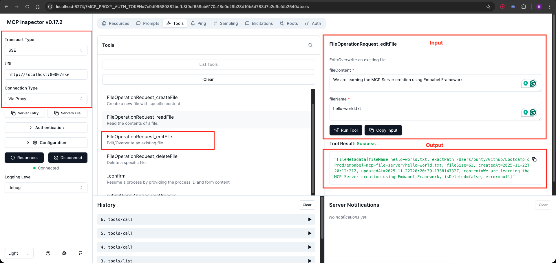 - EmbabelMcpFileServerApplication.java: The main class that boots up our Spring Boot application. It initializes the Spring context and prepares the application to listen for incoming MCP connections over SSE (Server-Sent Events).