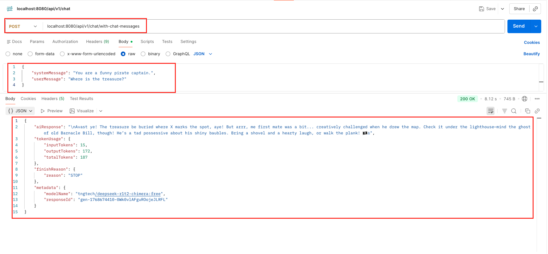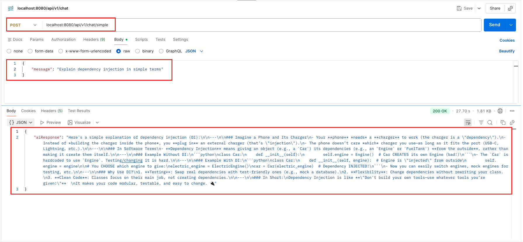 OPENROUTER_API_KEYenvironment variable and run the Spring Boot app. - Send a Request: Use Postman or cURL: